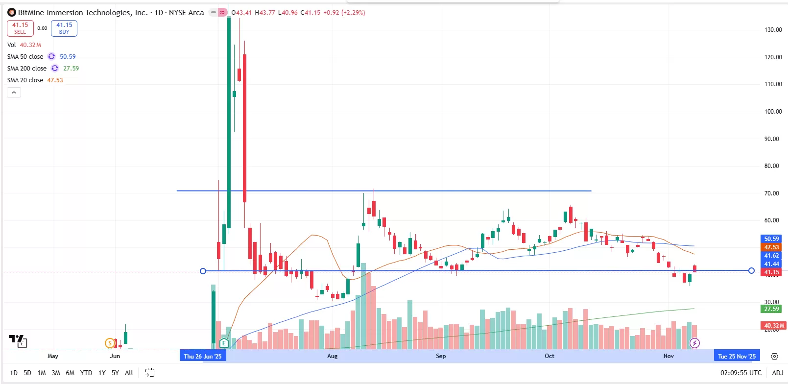 현재 비트마인은 역사적 저점 지지선($40~41)을 재테스트 중이며, 이 구간의 방어 여부가 단기 방향성을 결정합니다.