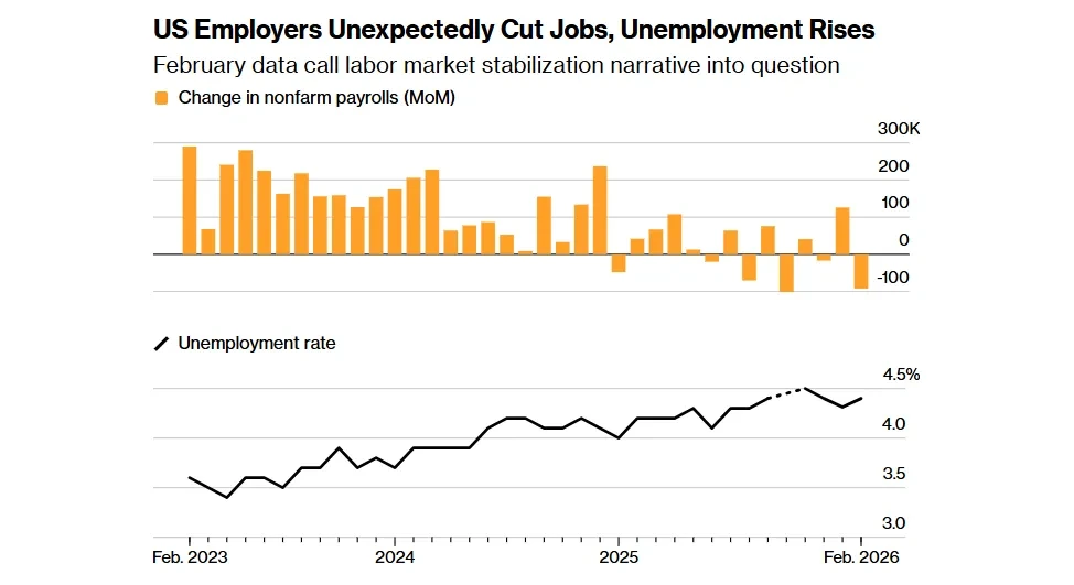 (시장 예상: +5만~6만 명 증가 / 이전 1월: +12만 6,000명으로 하향 수정) - 실업률: 4.4% (1월 4.3% → 상승, 시장 예상 4.3% 유지)